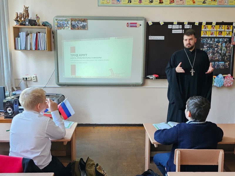 В рамках урока "Разговоры о важном" иерей Михаил вместе с учениками 6-го класса принял занятии, которое провела преподаватель Н. Быкова.